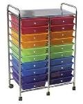 Ideal for the office, classroom, or home - great for organizing craft supplies. A multi-purpose organizer, complete with brightly colored polypropylene drawers, tubular chrome frame and top shelf. Unit glides easily into narrow spaces on 4 casters (2 locking). Ships Unassembled tools and instructions included.
